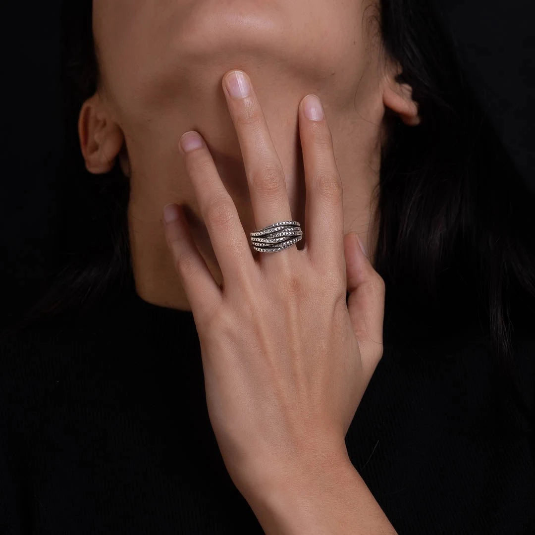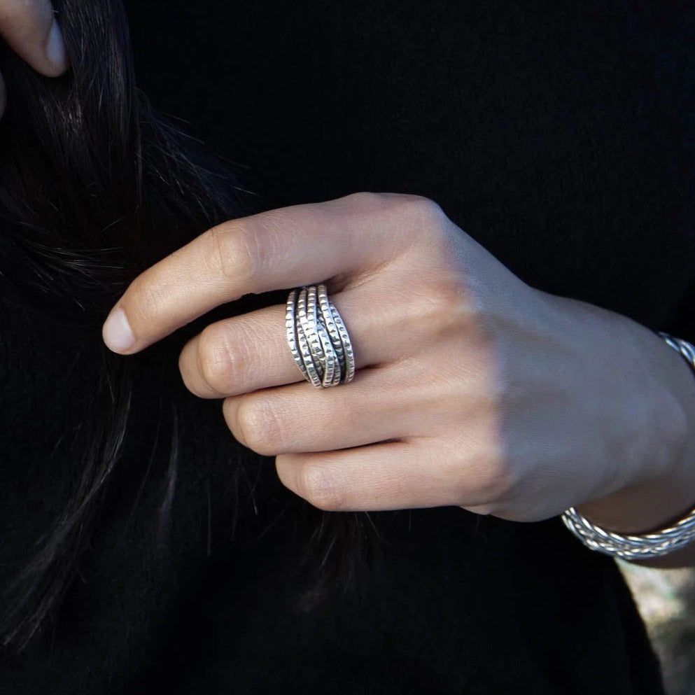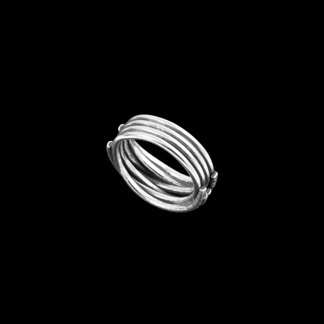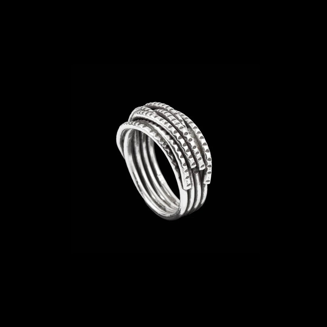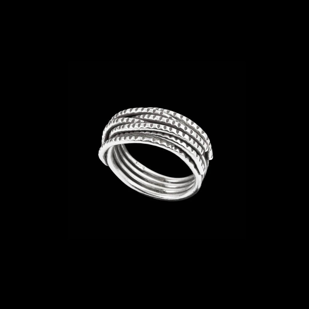 Anillo artesanal en plata maciza Compuesto por cuatro hijos deplata puro, patinado y punzados apretón de manos para hacer formas de muesca. El conjunto se deshace y ofrece todo su carácter a esta joyería. maciza y original.